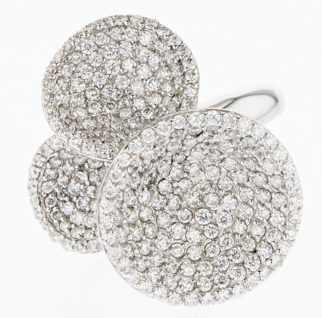 Sold18k White Gold Diamond RingMETAL: 18k White Gold. GEMSTONES: Diamonds approx. 2.88 ctw. MEASUREMENTS: Size 7 1/4, top measures 28mm x 23mm. MARKED: 18k, 750. WEIGHT: 9.3 grams. Gemstones have not been graded for color and clariSee Sold Price