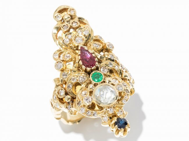 18K YG Gold Ring with Diamonds, Ruby & Emerald