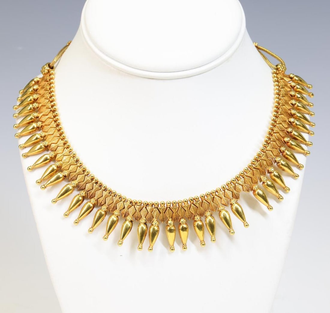 SoldELSA PERETTI 18K YG MESH NECKLACE AND EARRINGSElsa Peretti for Tiffany & Co. 18k yellow gold mesh bib necklace and screw back clip on dangle earrings for non-pierced ears. Necklace marked 'Peretti' and 'T&Co 750'. Earrings marked '750' beside a cSee Sold Price