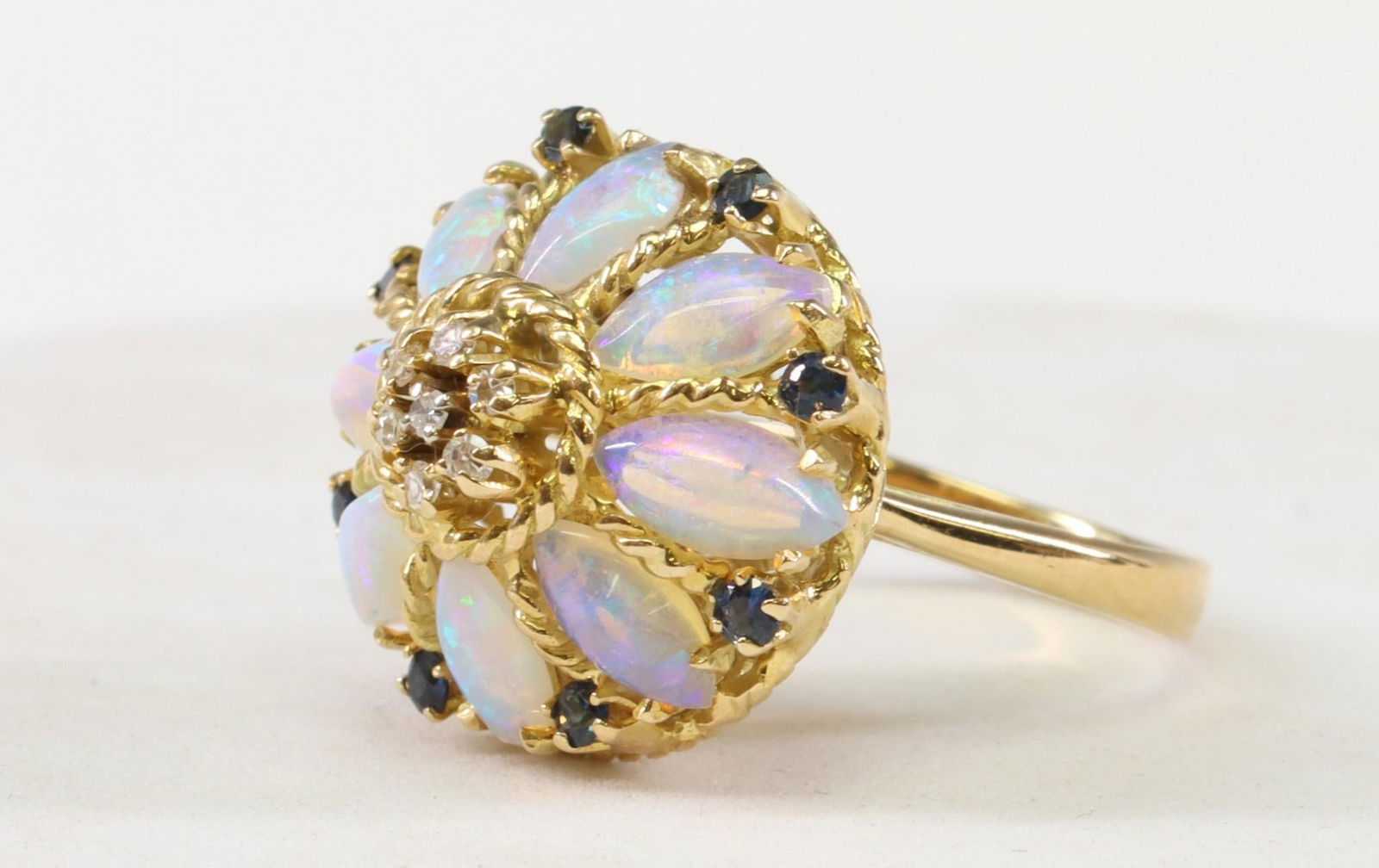 Sold14K Y/G opal diamond ring14K Y/G opal diamond ring set with 7 fine Austrian opals and 7 brilliant cut diamonds, total opal approx. 1.80ct, tdw approx. 0.25ct, wt. 8.1gm, size 7.5See Sold Price