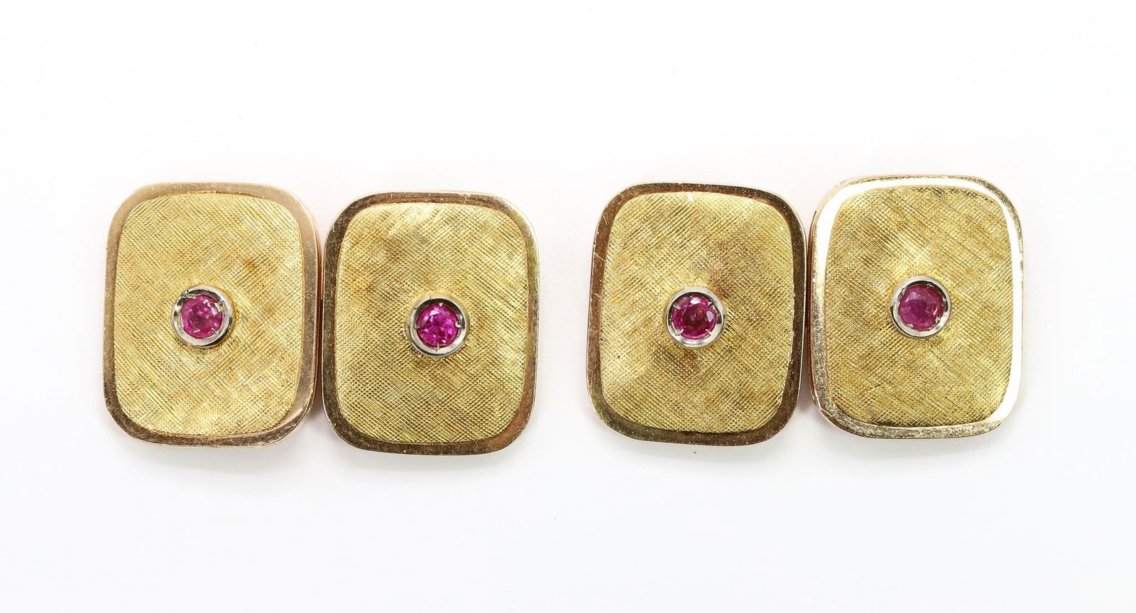SoldPR TIFFANY & CO STERLING 18kt YG & RUBY CUFFLINKSPair of Tiffany sterling silver cufflinks, each having four natural rubies set in 18kt yellow gold. Each marked Tiffany & Co, 925, 585. Each measures 21mm width.See Sold Price