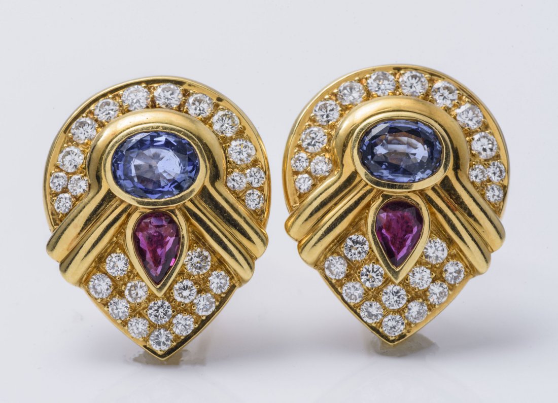 18K YG Sapphire, Ruby and Diamond Ear Clips.