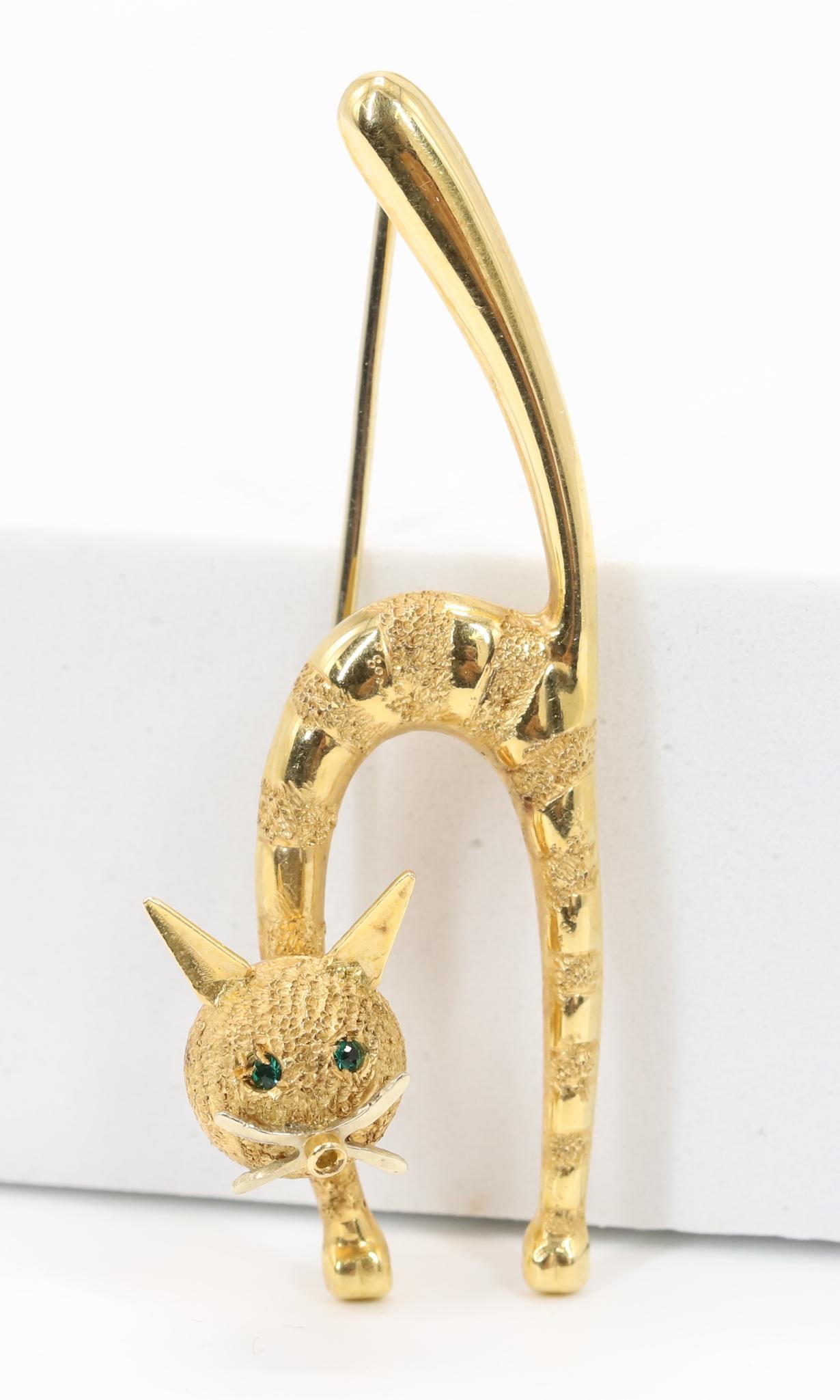 Sold18K Yellow Gold Feline Brooch Cat Pin with Emerald Gemstone EyesExcellent original condition, with the weight approx. 6.1 grams, having two 1.5 mm emeralds for eyes. The nose appears to be a black gemstone chip. Approx. 2" tall. Marked as shown.See Sold Price