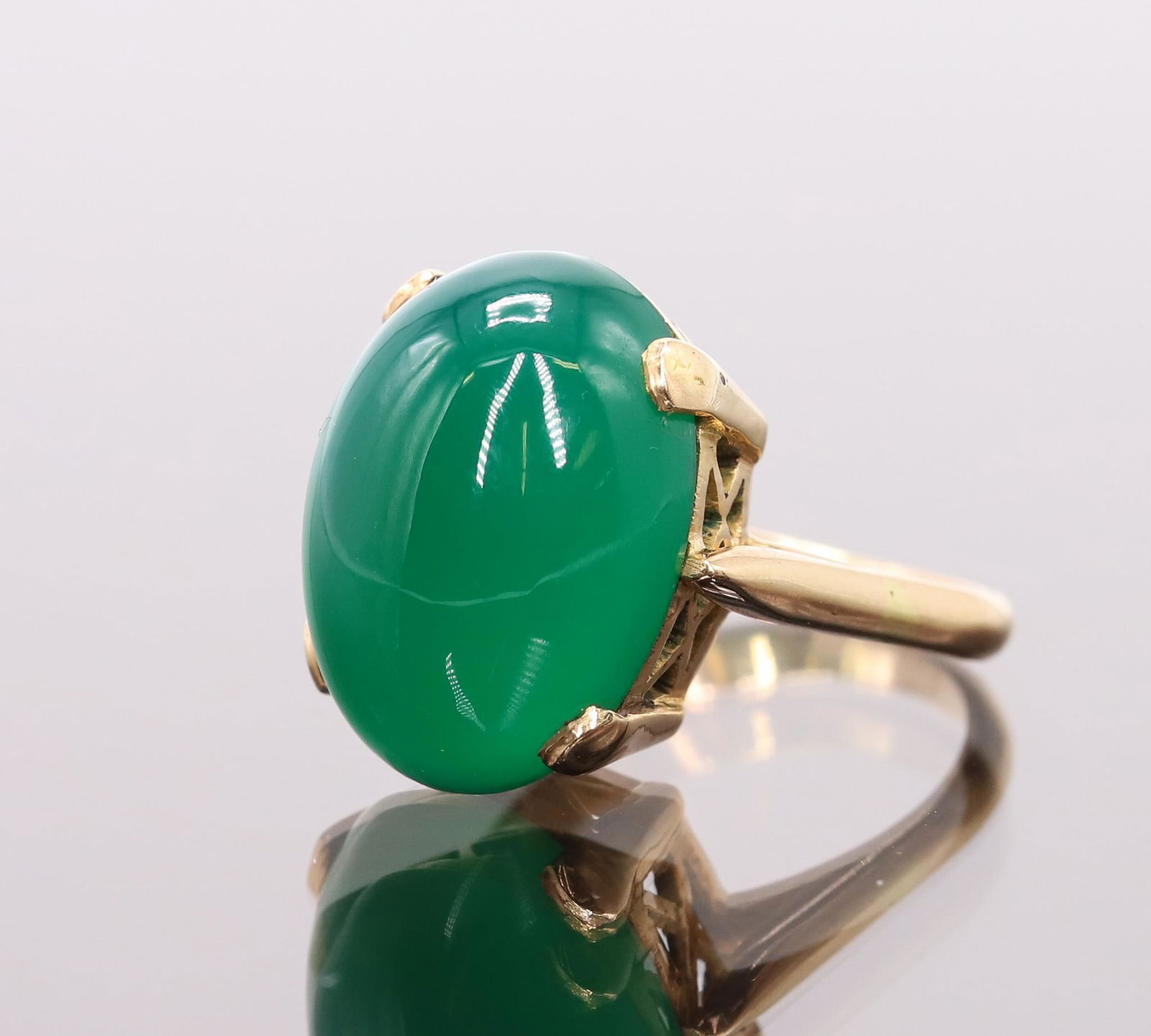 SoldVintage Gold and Green Onyx Cocktail RingVintage Gold and Green Onyx Cocktail Ring, Marked 10k on inner shank, approx. 20mm x 14.5mm green onyx cabochon set with four prongs, two at each end and side flower form prongs with leaves flanking tSee Sold Price