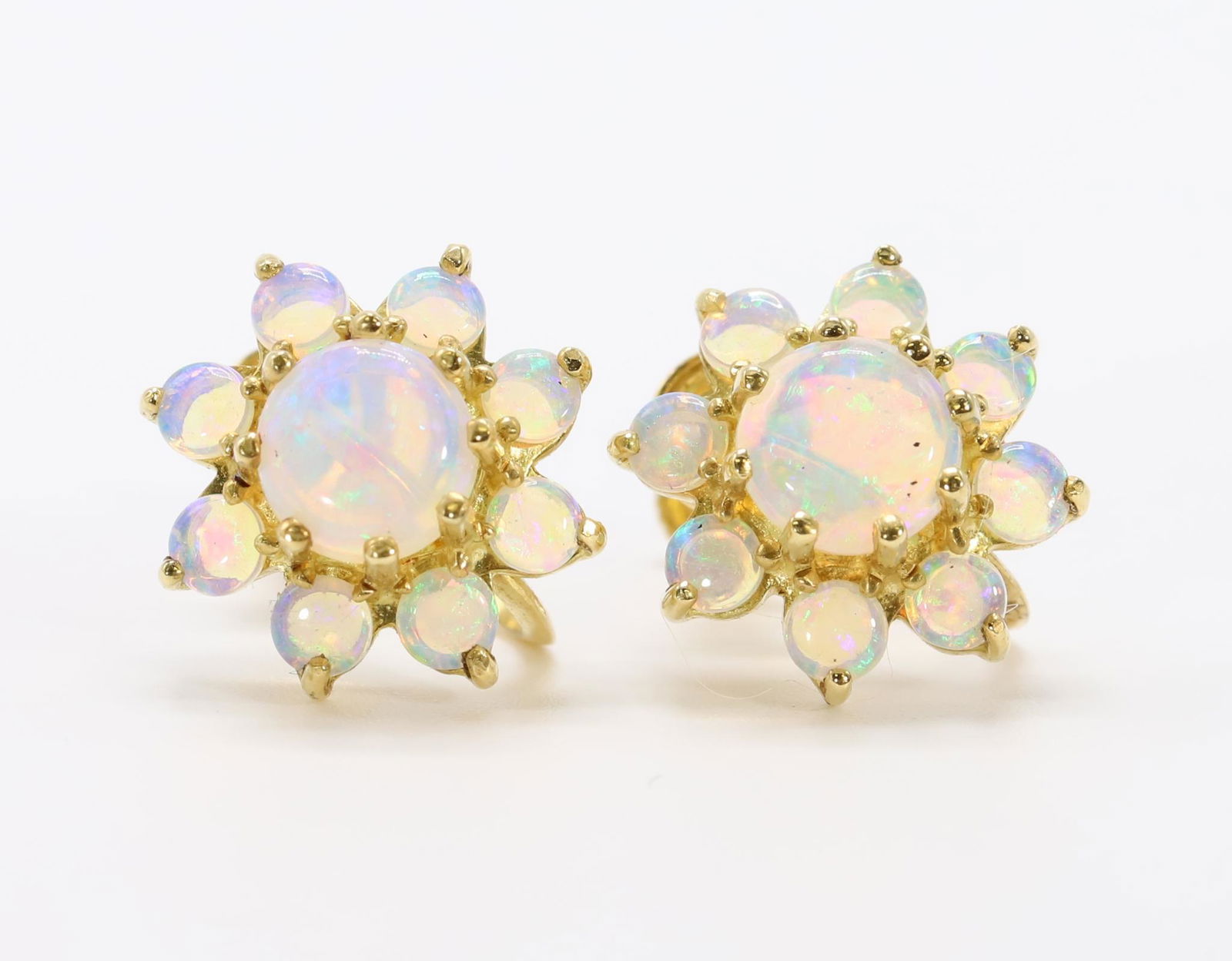 SoldPair of 14k Yellow Gold Opal EarringsPair of 14k Yellow Gold Opal Earrings. Stamped "14k" on stem, they measure 17 mm x 16 mm. Like-new condition. Payment by wire transfer only. If lot is absent of a condition report one may be requestedSee Sold Price