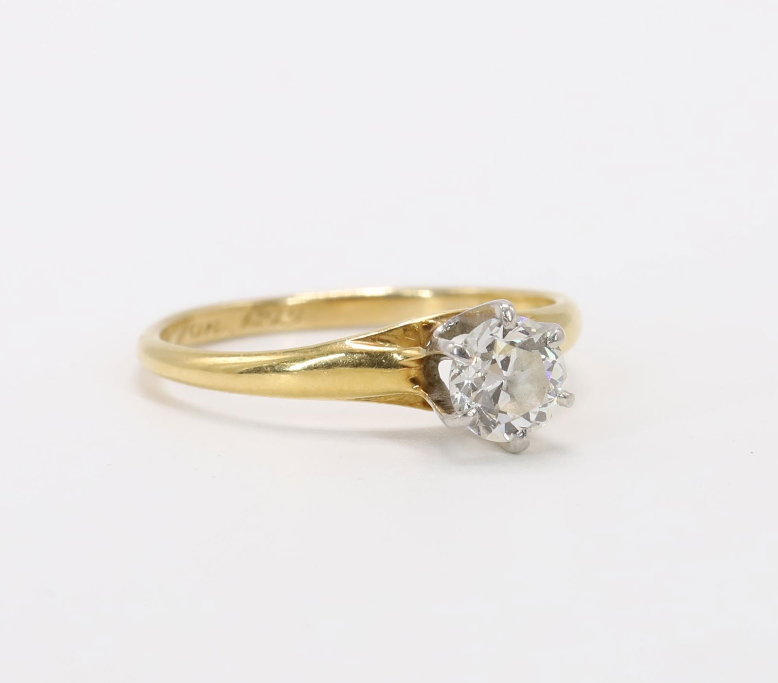SoldAntique Art Deco 18K Gold Platinum Diamond RingMETAL: 18k Gold and Platinum. GEMSTONES: Old mine cut diamonds approx. 0.80ctw, Rose cut diamonds approx. 24 stones. MEASUREMENTS: Ring size 8 1/4, ring top is 18.1mm wide. TESTED: 18k, Plat. WEIGHT:See Sold Price