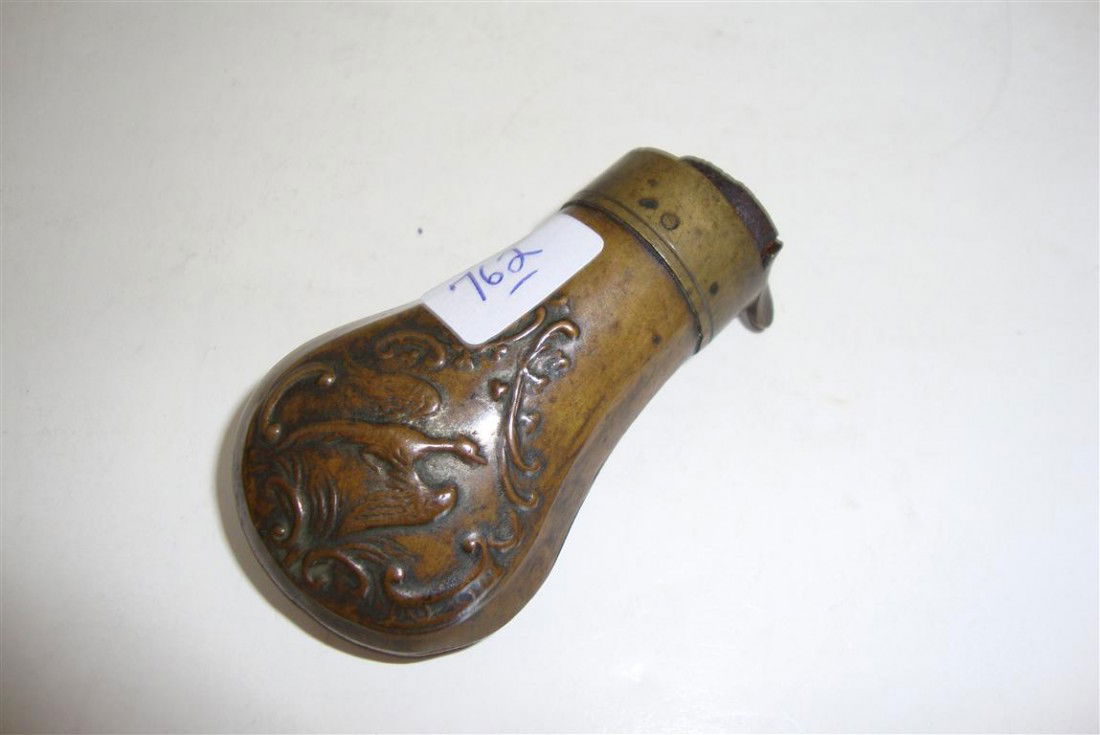 18TH C. BIRD DECORATED GUN POWDER FLASK