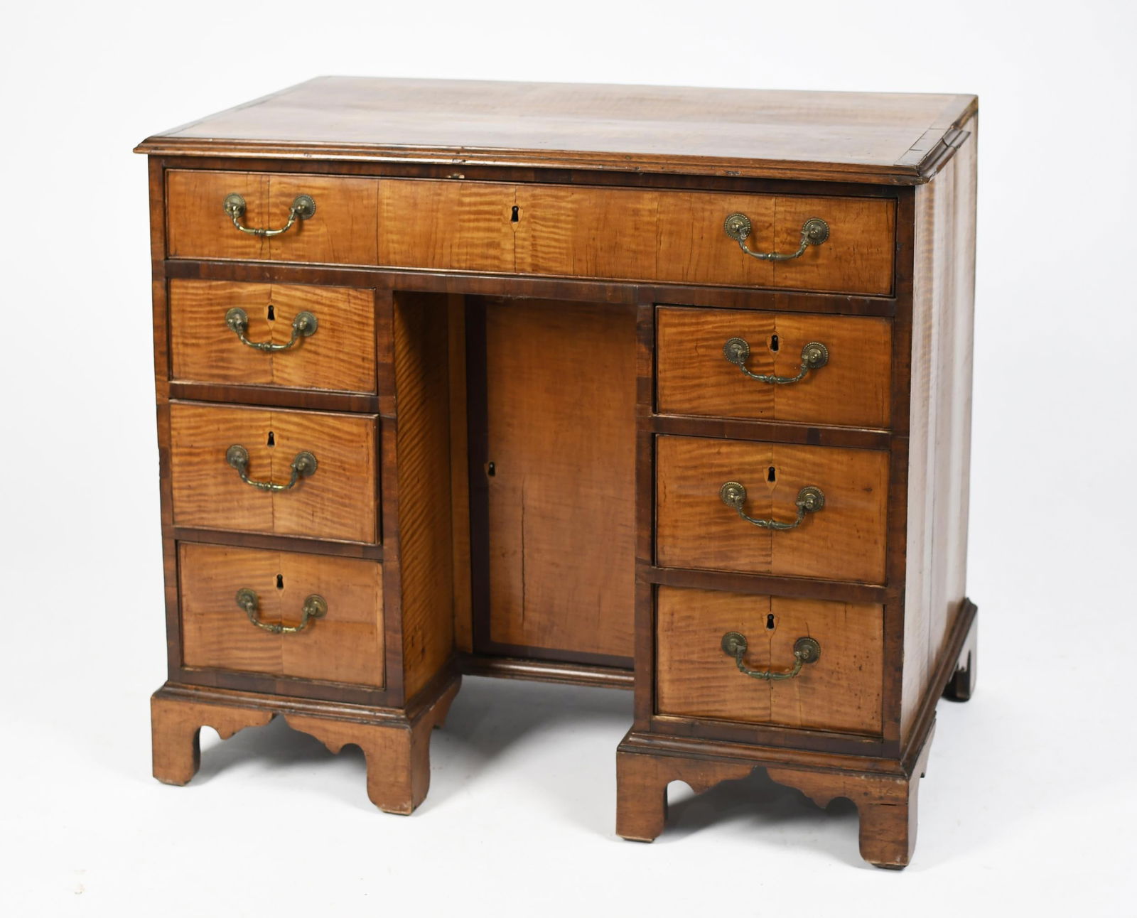 18TH C. CHIPPENDALE FIGURED MAPLE KNEE HOLE DESK.