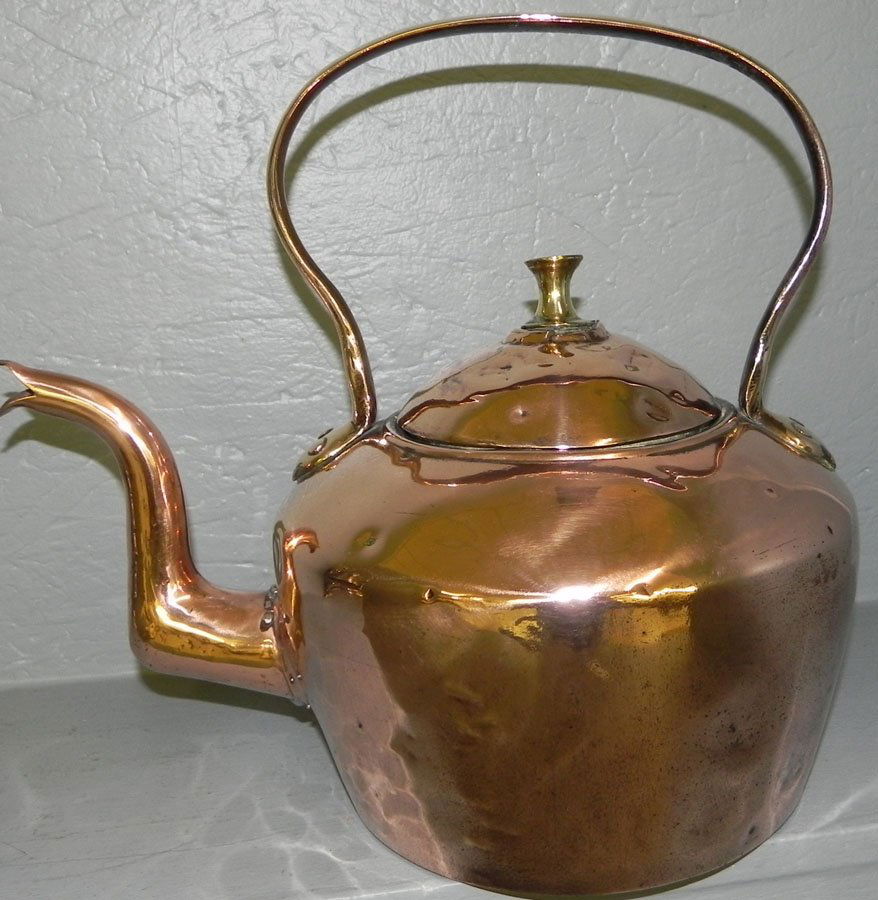 Antique Copper Tea Kettle Wood Handle Lidded Stove Top Pot