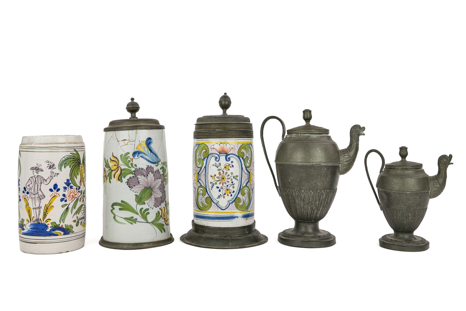 18th c German Faience Tankards, Pewter Teapots