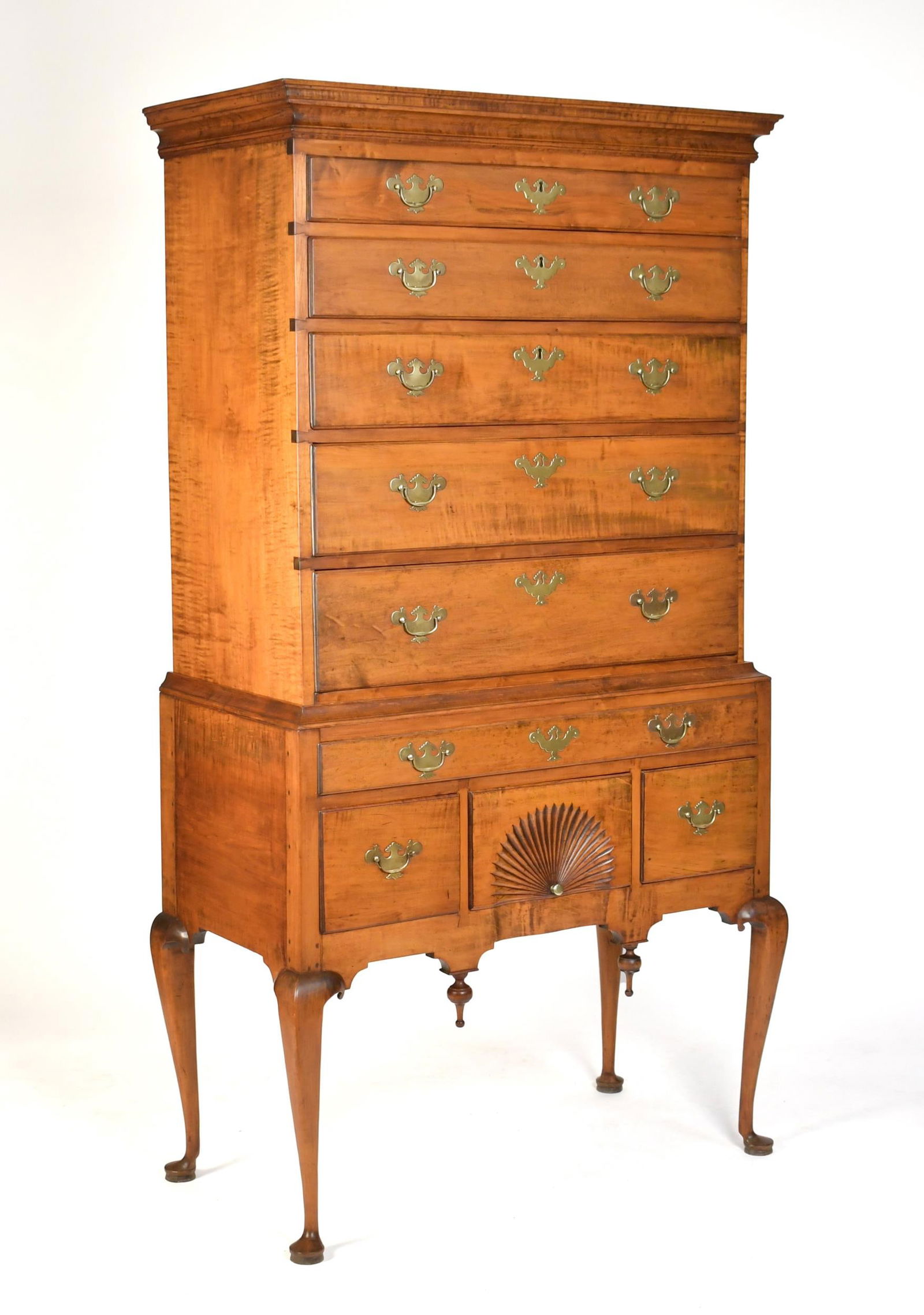 18TH C. NH QUEEN ANNE TIGER MAPLE HIGHBOY.