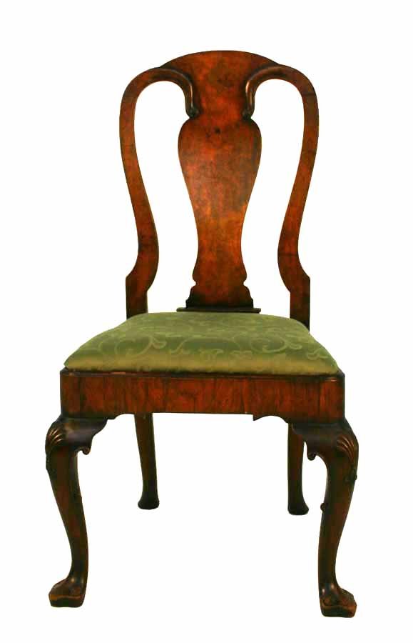 Sold(18th c) QUEEN ANNE BURL WALNUT SIDE CHAIRYoke crest, shaped splat and slip seat raised on cabriole legs and pad feet. 38 x 22 x 18 inches. 19 inch seatSee Sold Price