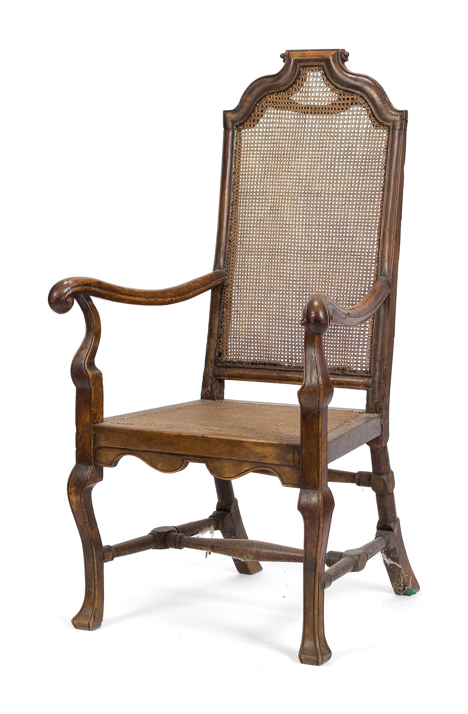 18TH C. QUEEN ANNE CANE BACK ARMCHAIR.