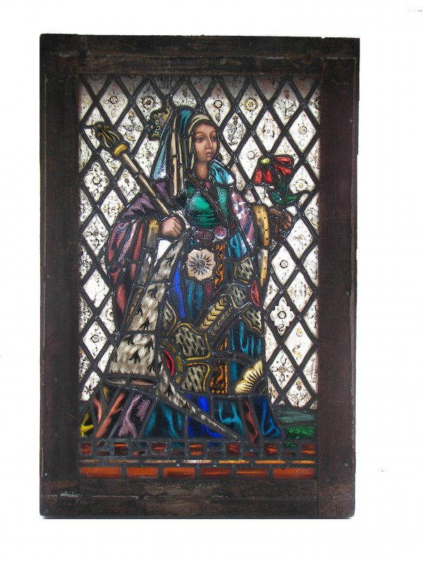 18th C. stained,leaded,painted window w/lady