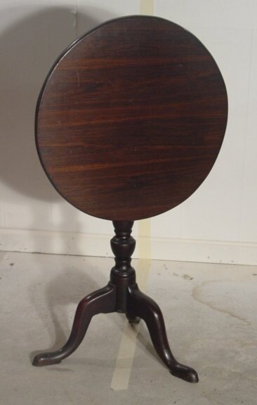 Sold18th c. Tilt Top Candlestand18th c. mahogany snake leg tilt top candlestand. Top 18 1/2" D., 27" Ht. (closed). One leg repaired, has small piece of wood missing.See Sold Price