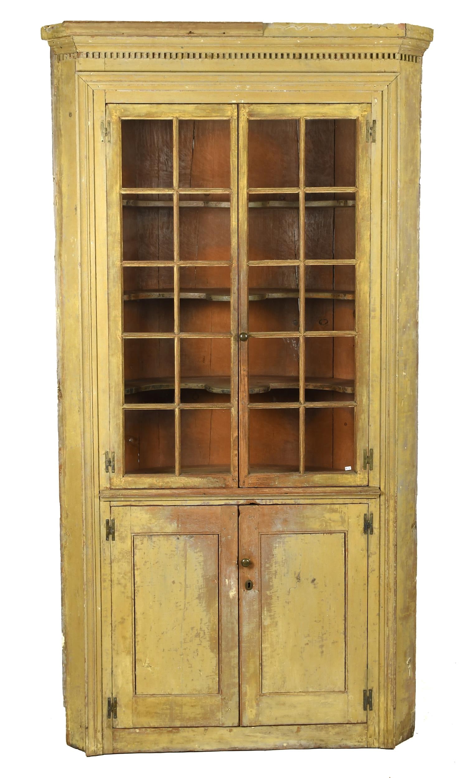 18TH C. YELLOW PAINTED CORNER CUPBOARD.