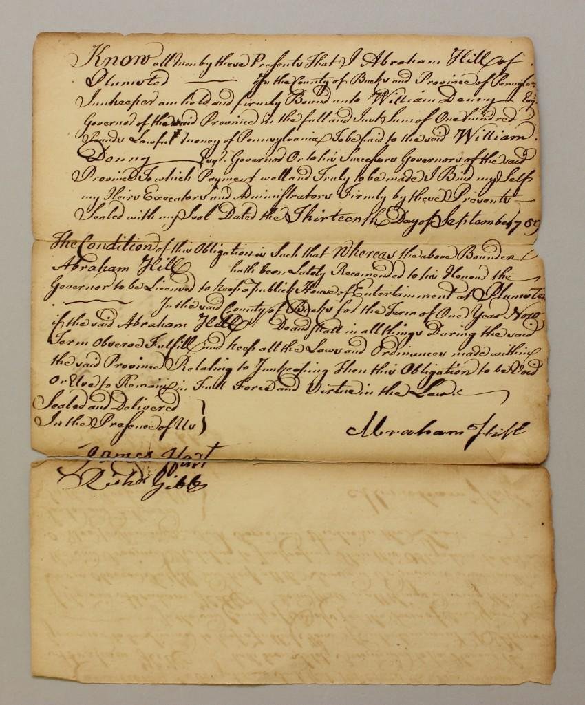 18th Century Contract for Innkeeper - Bucks County,