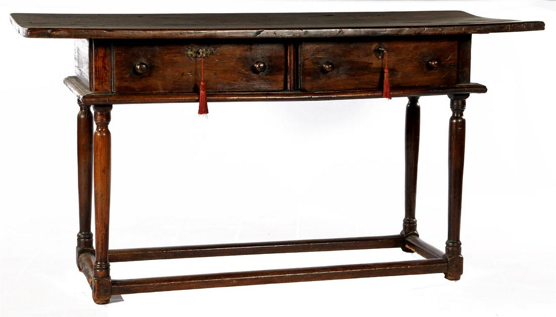 An English William and Mary oak work table, late 18th century4 days LeftEarly 19th Century Country Farmhouse Table / DeskMar 07, 2026Antique Wooden Trestle TableMar 03, 2026English Hepplewhite Mahogany and Satinwood Inlay Sideboard, 18th C., H 38" L 86" Depth 29"3 days LeftAn English William and Mary style single drawer table circa 18004 days LeftGeorge III Mahogany Side Table, c. 1800Feb 25, 2026A LATE REGENCY MAHOGANY SOFA TABLE, CIRCA 1820Mar 03, 2026A GEORGE I OAK CONSOLE TABLE CIRCA 1715, POSSIBLY REDUCED IN DEPTH2 days Left19TH C. AMERICAN COUNTRY TWO DRAWER TABLE IN RED.Feb 25, 2026RENAISSANCE STYLE CARVED WOOD 2-DRAWER WRITING TABLE / DESK6 days Left19TH C. COUNTRY LOW CABINET/ WORK CHEST.Feb 25, 2026Southern Chippendale Walnut One Drawer Tavern TableFeb 26, 2026Louis XV Style Occasional Table5 days LeftColonial style slant front writing desk w/one drawer, turned legs. Interior has one drawer & 4Feb 24, 2026Handsome American Queen Anne Black Walnut Harvest TableFeb 28, 2026Large American Quarter-Sawn Oak Clerk's DeskFeb 27, 2026