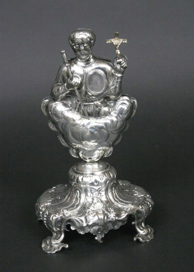 Sold18th C. Spanish Silver Reliquary w/ Saints, ex-HistoriaEurope, Spain, ca. 18th century. A beautiful reliquary, comprised of silver with bronze bezels, the sides adorned with a floral motif, housing two 18th century engraved images of saints protected withSee Sold Price