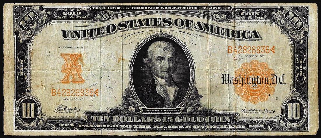 Sold1907 $10 Gold Certificate Large Note VF/XF1907 $10 Gold Certificate Large Note VF/XF - Please ask questions and read terms & conditions before bidding.See Sold Price