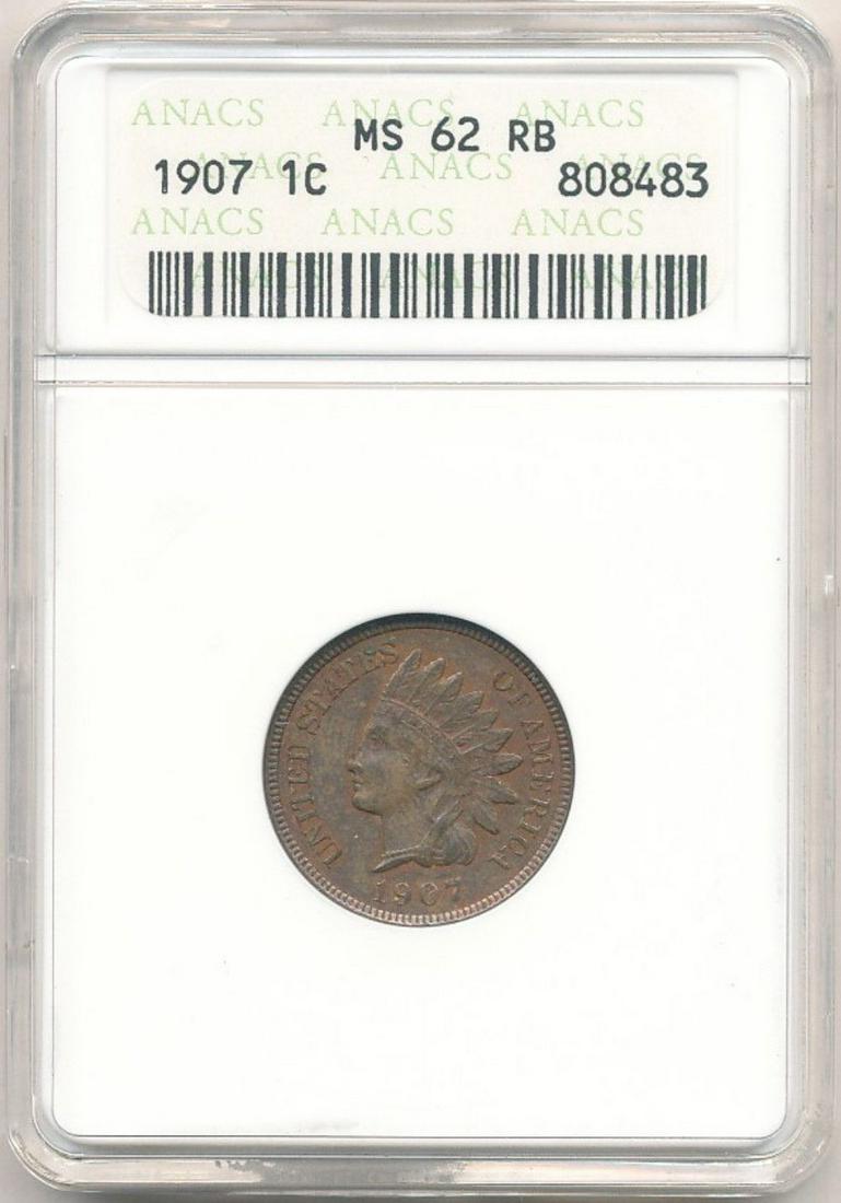 1907 Indian Head Cent ANACS MS62 RB