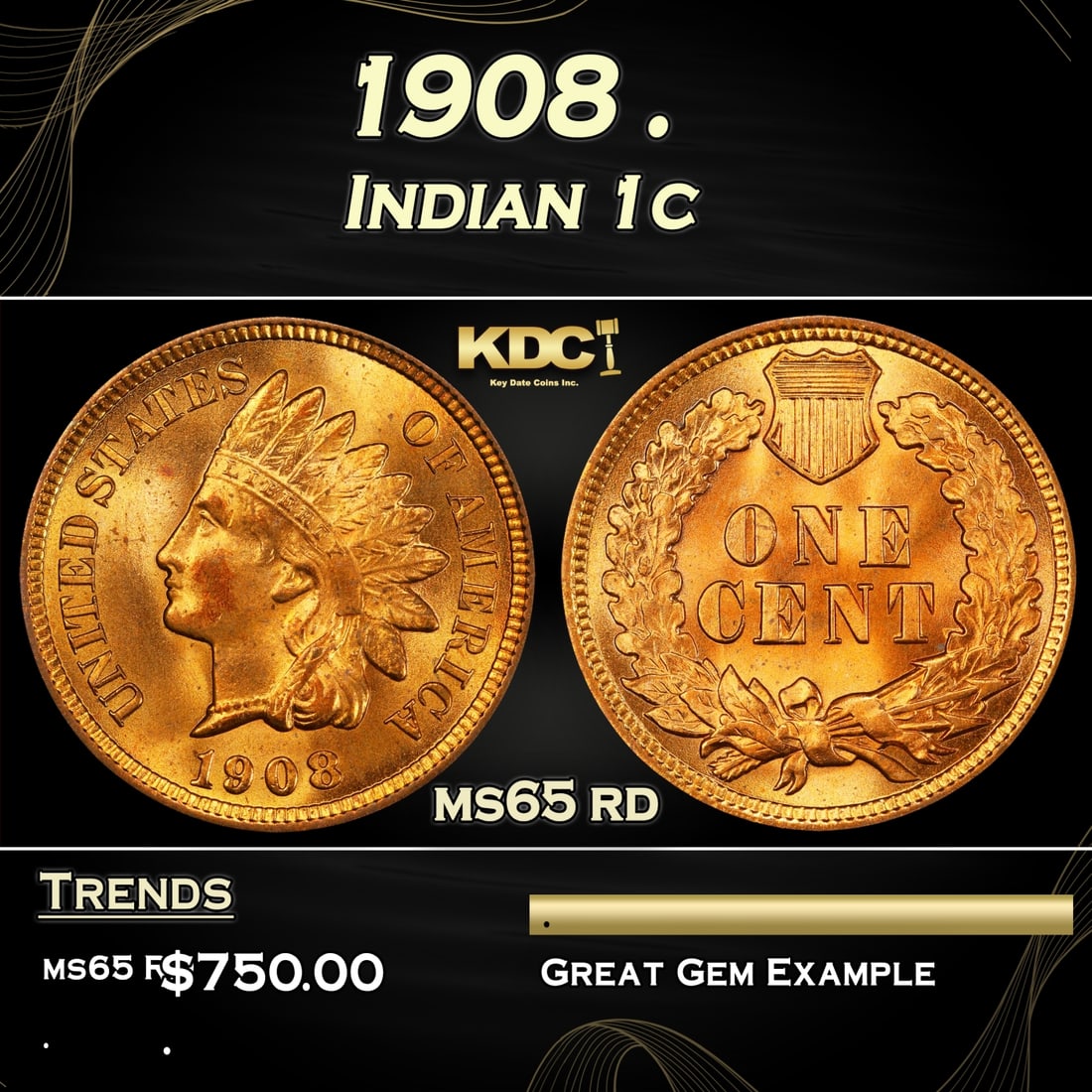 1908 Indian Cent . 1c Grades ms65 rd