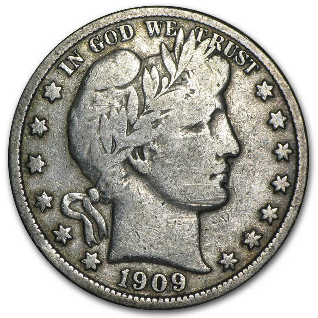 Sold1909 S Silver Barber Half Dollar 50c G-VG1909-S 50c Barber Silver Half Dollar G-VG. Design by Charles E. Barber, weight: 12.50 grams; Mintage: 1,764,000See Sold Price