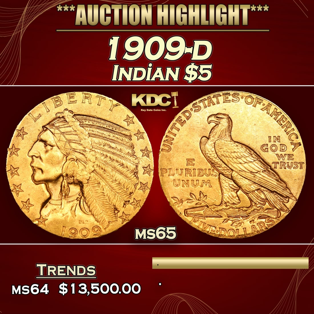 1909-d Gold Indian Half Eagle $5 ms64 USCG