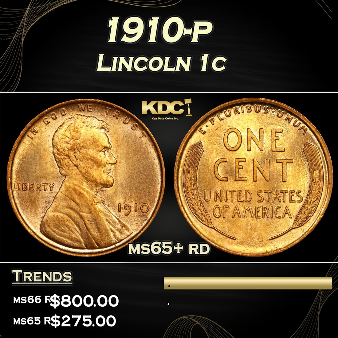 1910-p Lincoln Cent 1c Grades ms65+ rd