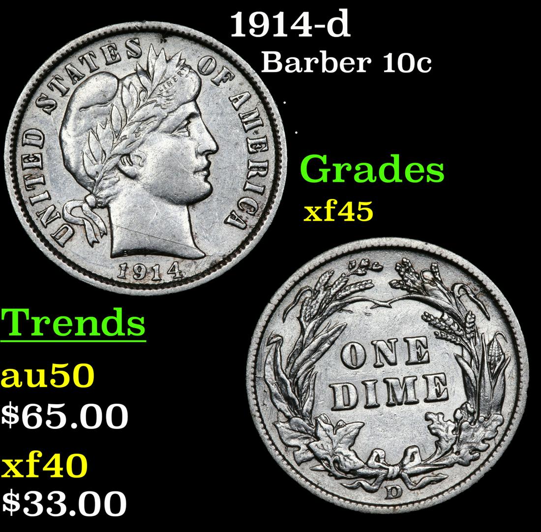 1914-d Barber Dime 10c Grades xf+