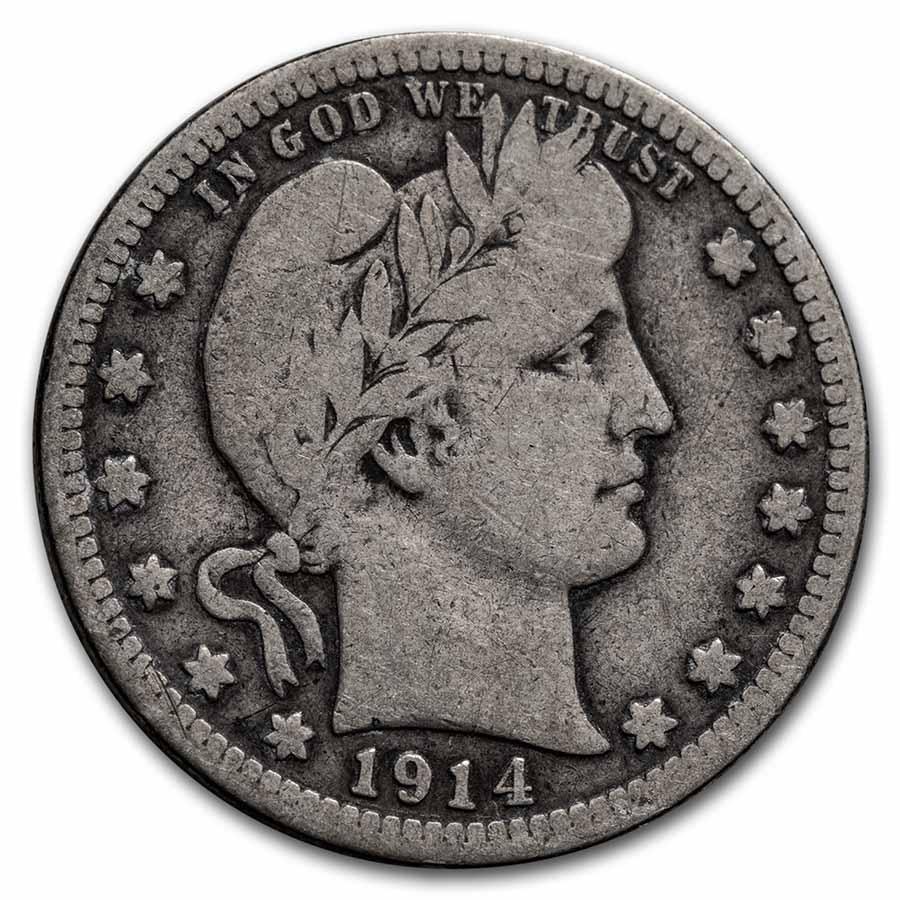 Barber Silver Quarter is VG Uncertified from 1914-S