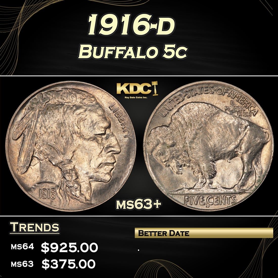 1916-d Buffalo Nickel 5c Grades ms64
