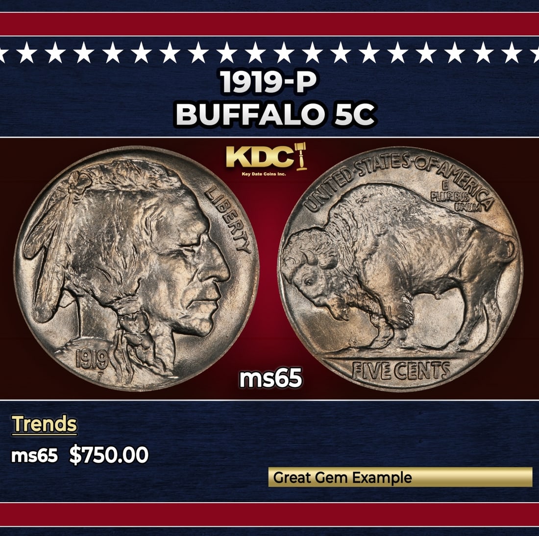 1919-p Buffalo Nickel 5c Grades ms65