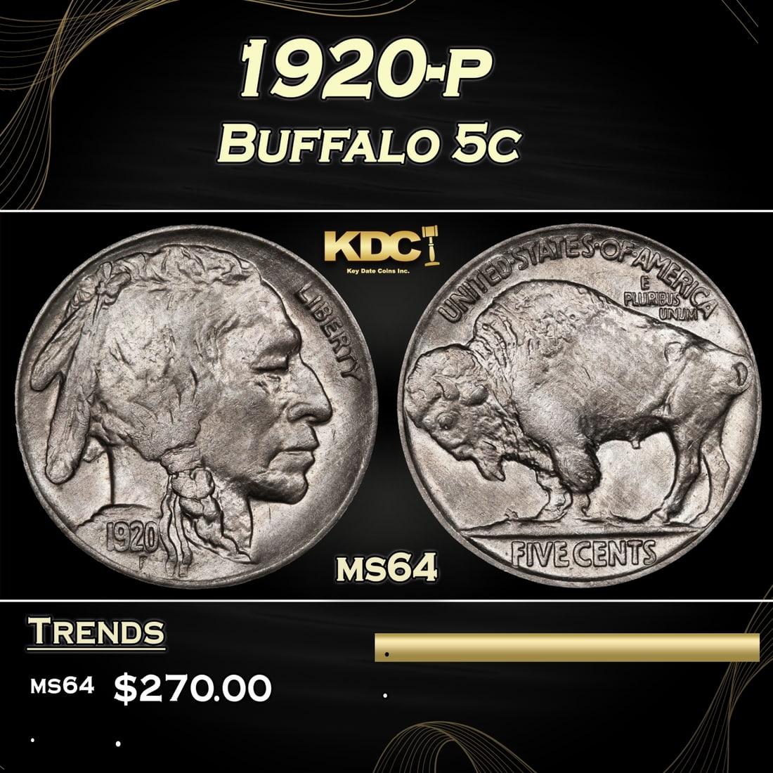 1920-p Buffalo Nickel 5c Grades ms64
