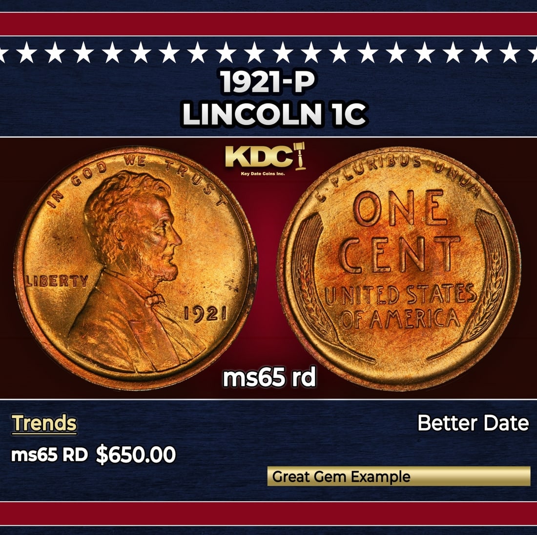 1921-p Lincoln Cent 1c Grades GEM Unc RD