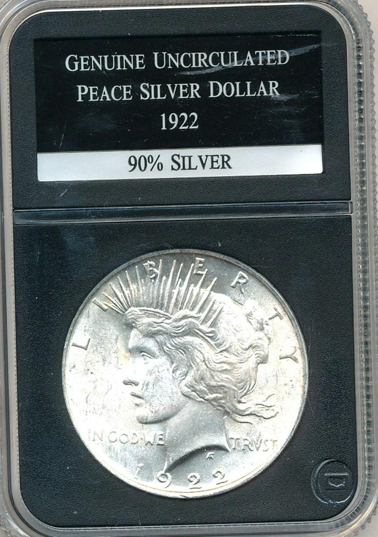 Sold1922 Peace Silver Dollar Choice Brilliant Uncirculated1922 Peace Silver Dollar, great details, beautiful coin. Mint: Philadelphia. Mintage: 51,737,000. Weight 26.73 grams, 0.900 fine silver, 0.7734 oz. ASW. 38.1 mm : Obv. of the Peace Dollar features theSee Sold Price
