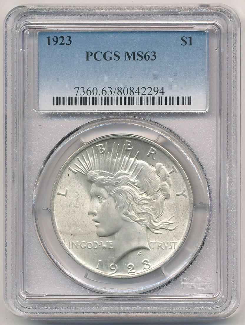 SoldPCGS CERTIFIED 1923-P MS63 PEACE SILVER DOLLAR..PCGS CERTIFIED 1923-P MS63 PEACE SILVER DOLLAR. $4.00 DOMESTIC SHIPPING.See Sold Price