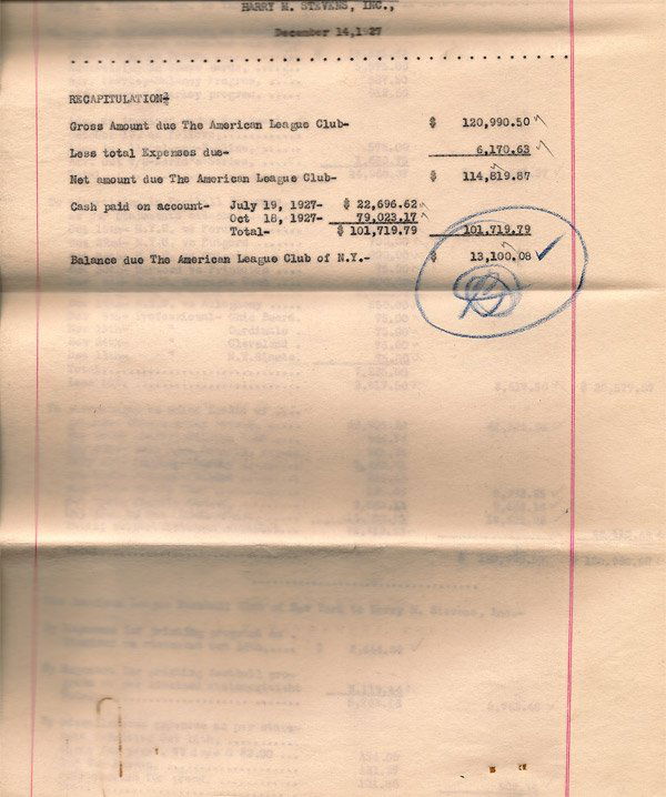 1927, Yankees, Harry M. Stevens Yr. End Statement