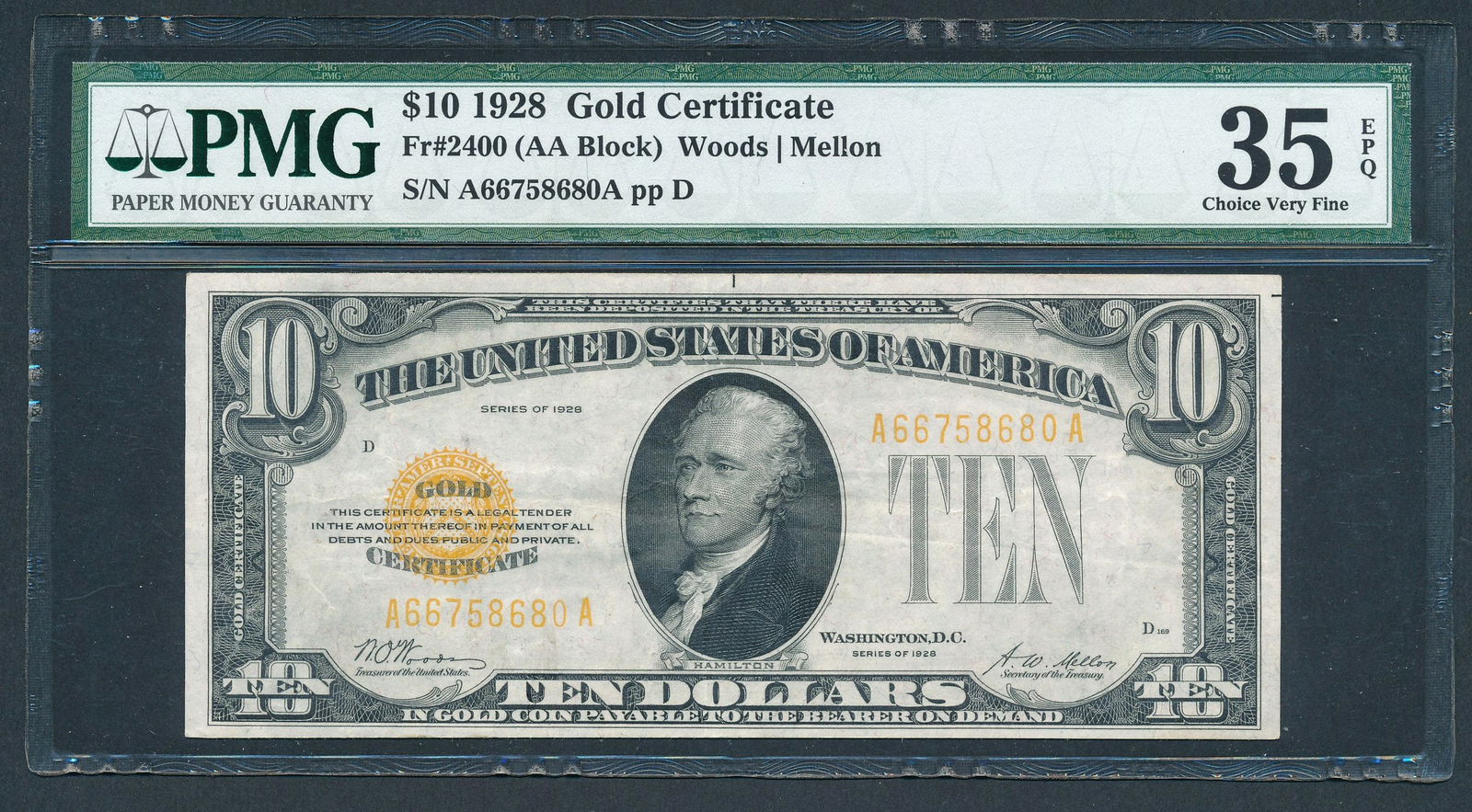 Sold1928 $10 Gold Certificate Signatures Woods/Mellon Grades xf+1928 $10 Gold Certificate Signatures Woods/Mellon Grades xf+. FR-2400 Alexander Hamilton is the central subject of this scarce $10 gold note, issued because of a change in the size of United States cuSee Sold Price