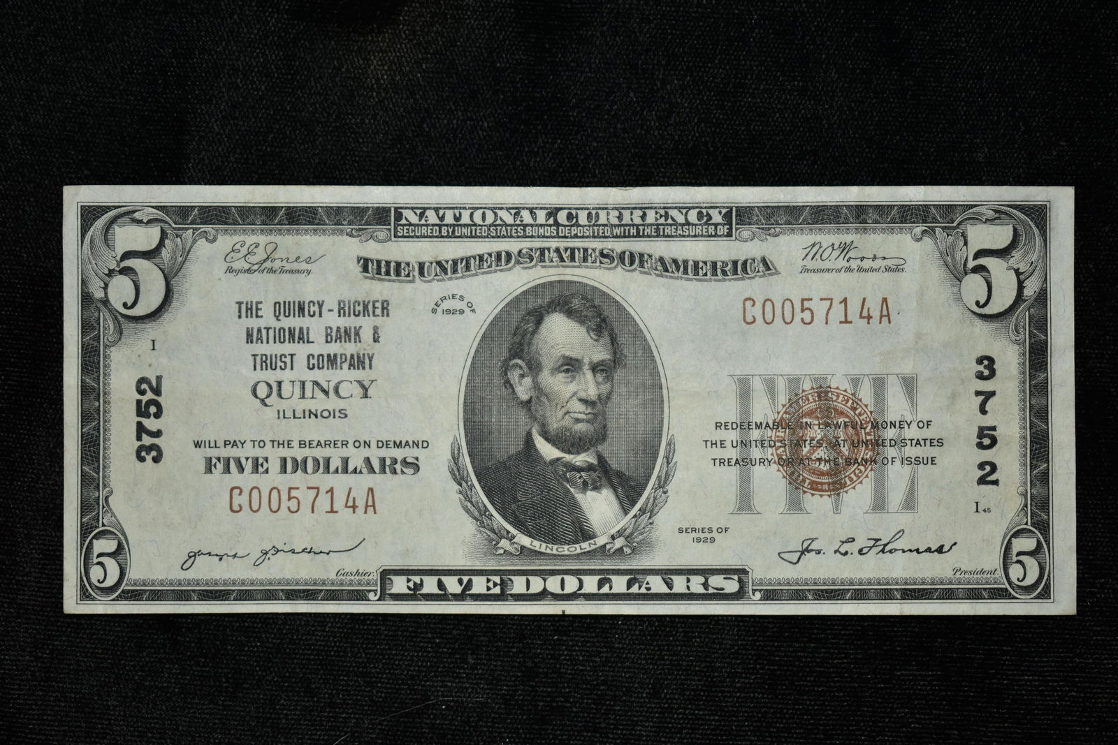 5 Dollar Bill, 1929, Quincy Ricker National Bank