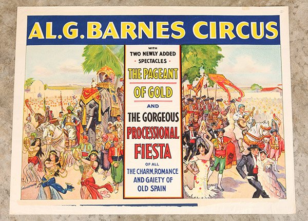 Sold1929 Al. G. Barnes Circus PosterOriginal colorful paper poster with "The Pageant of Gold and The Gorgeous Professional Fresta." 21" x 28".See Sold Price