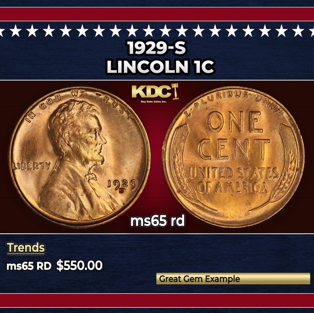 1929-s Lincoln Cent 1c Grades ms65 rd