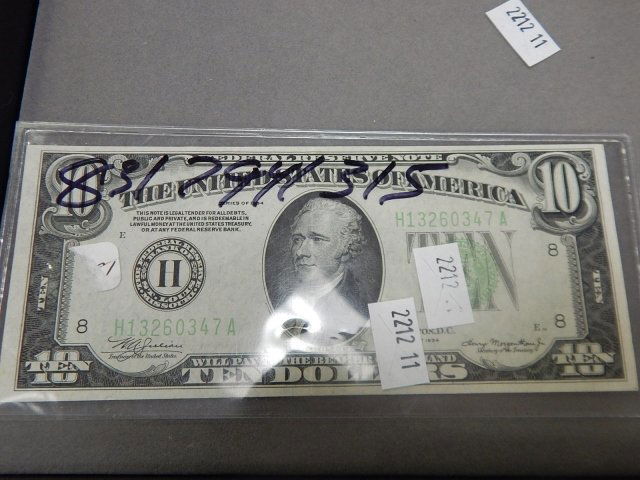 Sold6 $10 Dollar Bills - 1934 & 1928 Green SealsGroup of 6 $10 Bills, Green Seals- 3 1928 & 3 1934. Selling as found. They have not been sorted or graded. These are selling at the conclusion of our regular antique auction and are part of a large liSee Sold Price