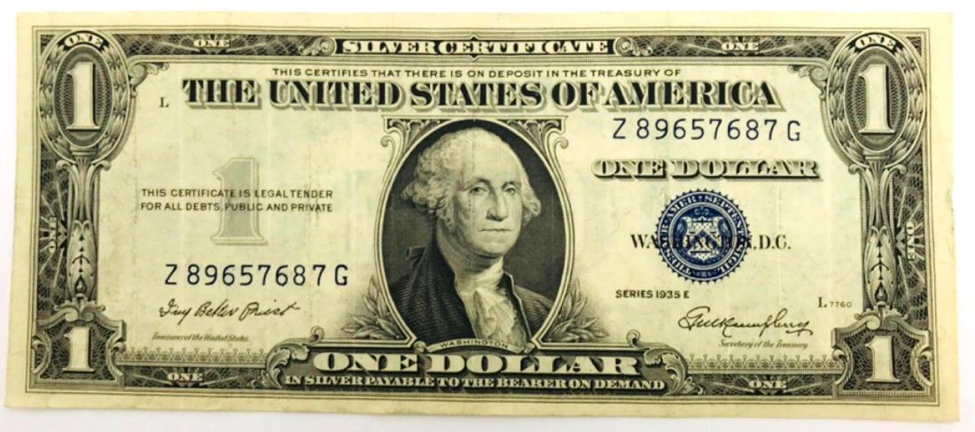 USA $1 Silver Certificate 1935 D – Serial B43448277GFeb 22, 20261957 United States Silver Certificate One Dollar S82857771AFeb 22, 2026USA 1935D One Dollar Silver Certificate Blue Seal – Fr. 1613Feb 22, 2026United States 1935E One Dollar Silver Certificate – Series G95683272IFeb 22, 2026United States $1 Silver Certificate 1935E Blue SealFeb 22, 20261928A USA $1 Silver Certificate – Washington Portrait, Blue SealFeb 22, 2026United States 1935A $1 Silver Certificate, Serial G22682321AFeb 22, 2026United States 1935E $1 Silver Certificate – Priest / HumphreyFeb 22, 2026United States 1957B $1 Silver Certificate – WashingtonFeb 22, 20261935E United States $1 Silver Certificate Blue SealFeb 22, 20261957 United States $1 Silver Certificate Blue SealFeb 22, 20261928 $1 Silver Certificate Fr# 1600 PMG GEM 65 EPQ Uncirculated2 days Left1923 $1 Silver Certificate FR. 237 Very Fine Circulated16 hrs Left1957B USA $1 Silver Certificate Blue Seal WashingtonFeb 22, 20261957-A $1 Silver Certificate 34 Consecutive Notes Superb Gem CU3 days Left1935 or 1957 $1 Blue Seal Silver Certificate Federal Reserve Note Bill13 hrs Left