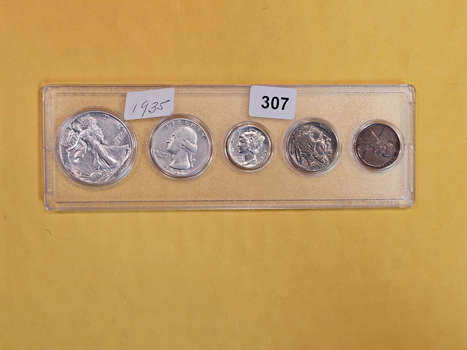 Sold1935 U.S. COIN SET FEATURES FOUR 90% SILVER COINS AS WELL AS A BUFFALO NICKEL AND WHEAT CENT.See Sold Price