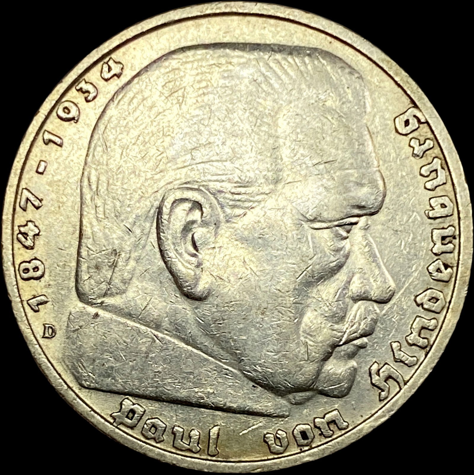 Sold1938-D Germany Silver 5 Reichsmark CLOSELY UNCIRCULATED1938-D Germany Silver 5 Reichsmark CLOSELY UNCIRCULATEDSee Sold Price