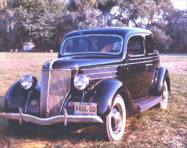 SoldCK 1936 NEW FORD SEDANhandpainted tin, windup working, 4 3/4†long, w/orig garage box, some wear & missing 1 flap, C6-7.See Sold Price