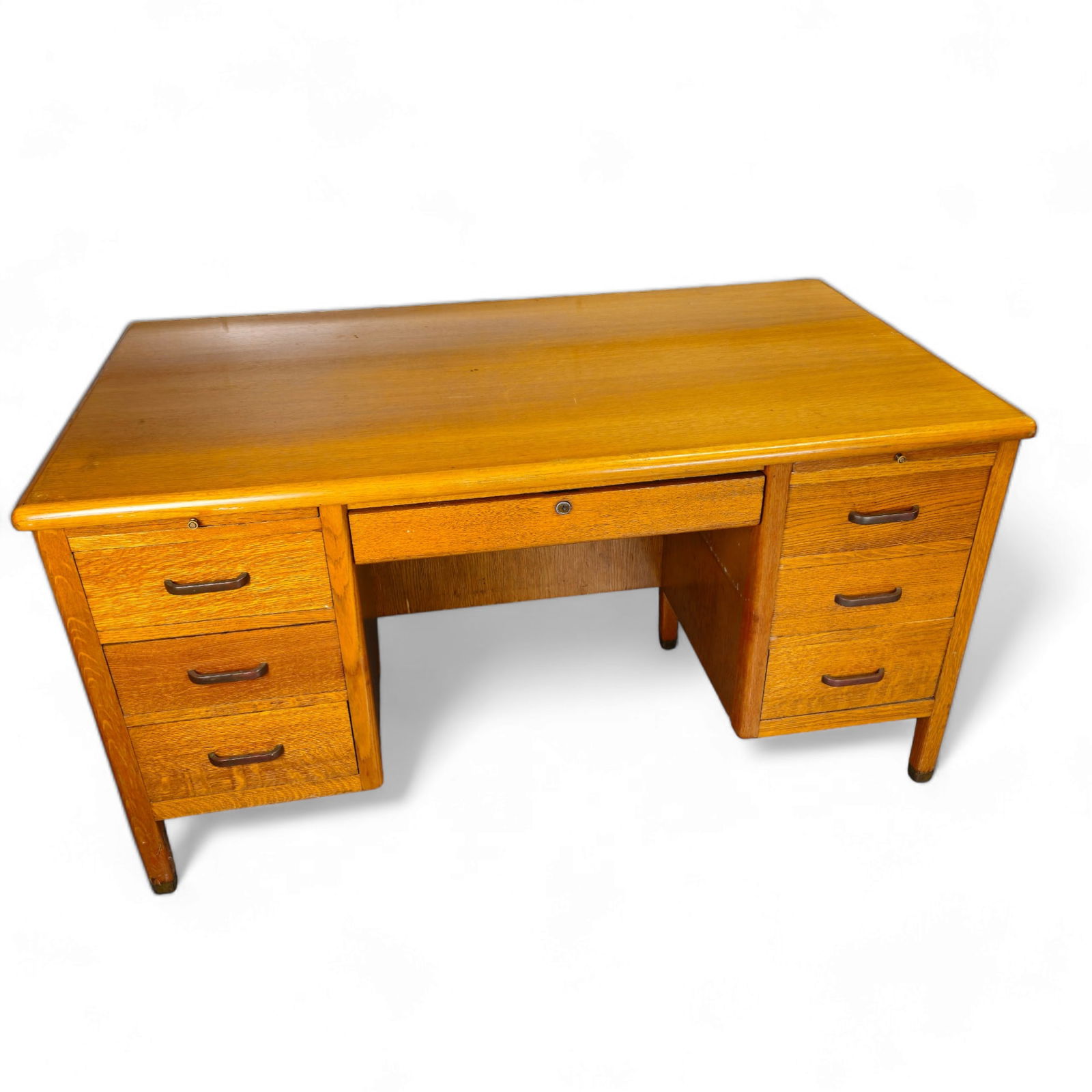 SoldJackson Executive DeskJackson maker marked mid-century executive style wooden desk, produced by Jasper Office Furniture Company (Jasper, Indiana), having oversize top above middle key lock drawer, with left side of desk haSee Sold Price