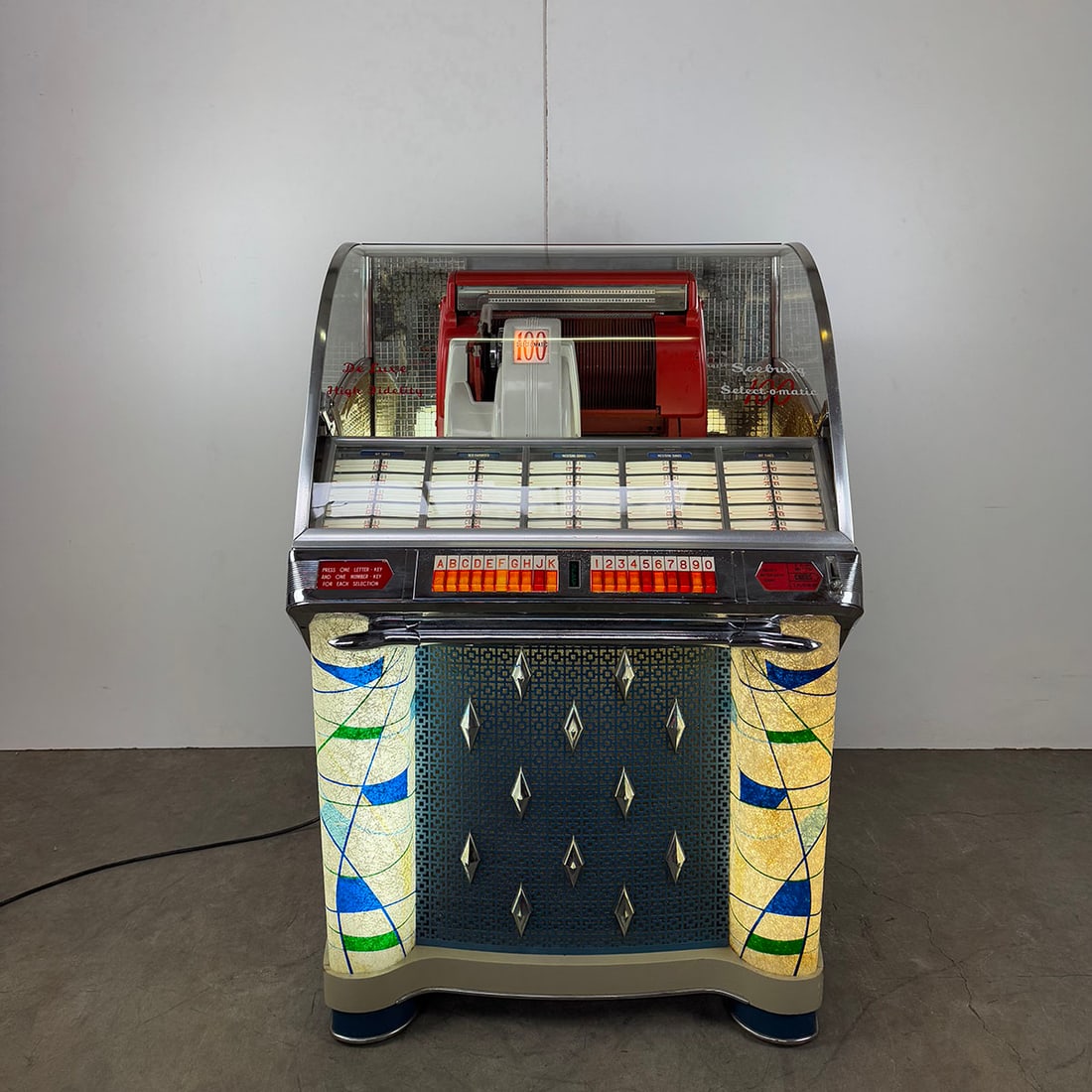 SoldSeeburg 100 Select-O-Matic Jukebox (1953)Seeburg Select-O-Matic 100 jukebox, model HF100G, manufactured 1953. High-fidelity design with chrome trim, curved glass dome, and blue mechanism housing. Features 100 selections (50 records) with visSee Sold Price