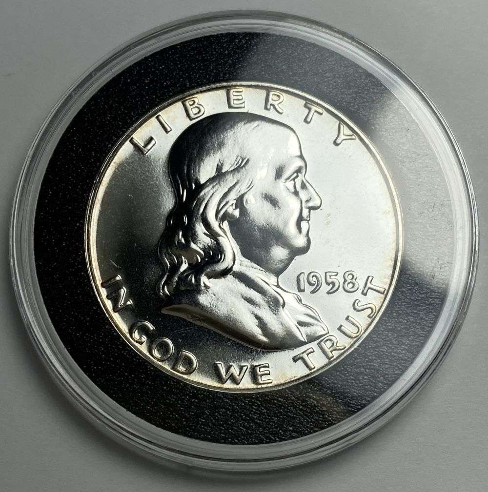 Sold1958 Franklin Silver Half Dollar PF68+Winner shall receive the exact coin shown here. (RR/B)See Sold Price